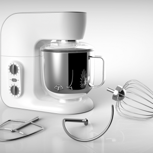 產(chǎn)品定位為一款使用環(huán)境定位兼容普通家用和商用的多功能型廚房料理機(jī),具有揉面,打蛋,攪拌等功能。傳動(dòng)部分主要是皮帶帶動(dòng)齒輪傳送攪拌力。產(chǎn)品機(jī)身材質(zhì)采用鑄鋁機(jī)身材質(zhì)和ABS工程塑料搭配,與傳統(tǒng)單純鑄造機(jī)身相比具有更加輕巧的造型,不同的材質(zhì)對(duì)比也彰顯產(chǎn)品的品質(zhì)。