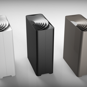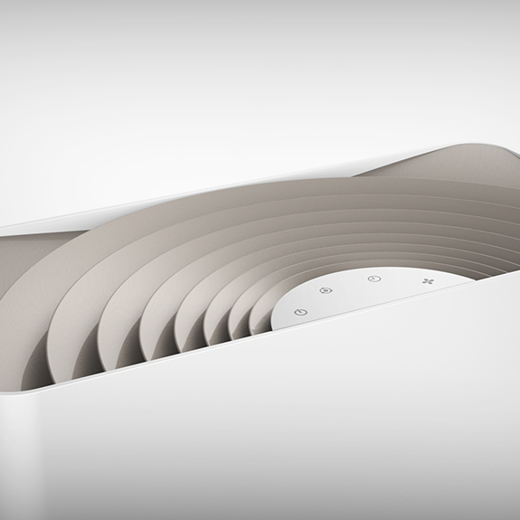 整體的設(shè)計概念大多取自自然的元素,增加了工業(yè)產(chǎn)品的人情味。材質(zhì)的選用和搭配簡潔明了,不突兀,更容易融入各種使用環(huán)境。出風口的設(shè)計抽象于安靜水面上泛起的一絲漣漪,擴散的語言也符合出風的寓意。機器背面的進風口的設(shè)計在符合整體有機、自然的風格下也加強了進風的產(chǎn)品語義。整體設(shè)計在平面的外表下又具備一些充滿靈氣的細節(jié)。